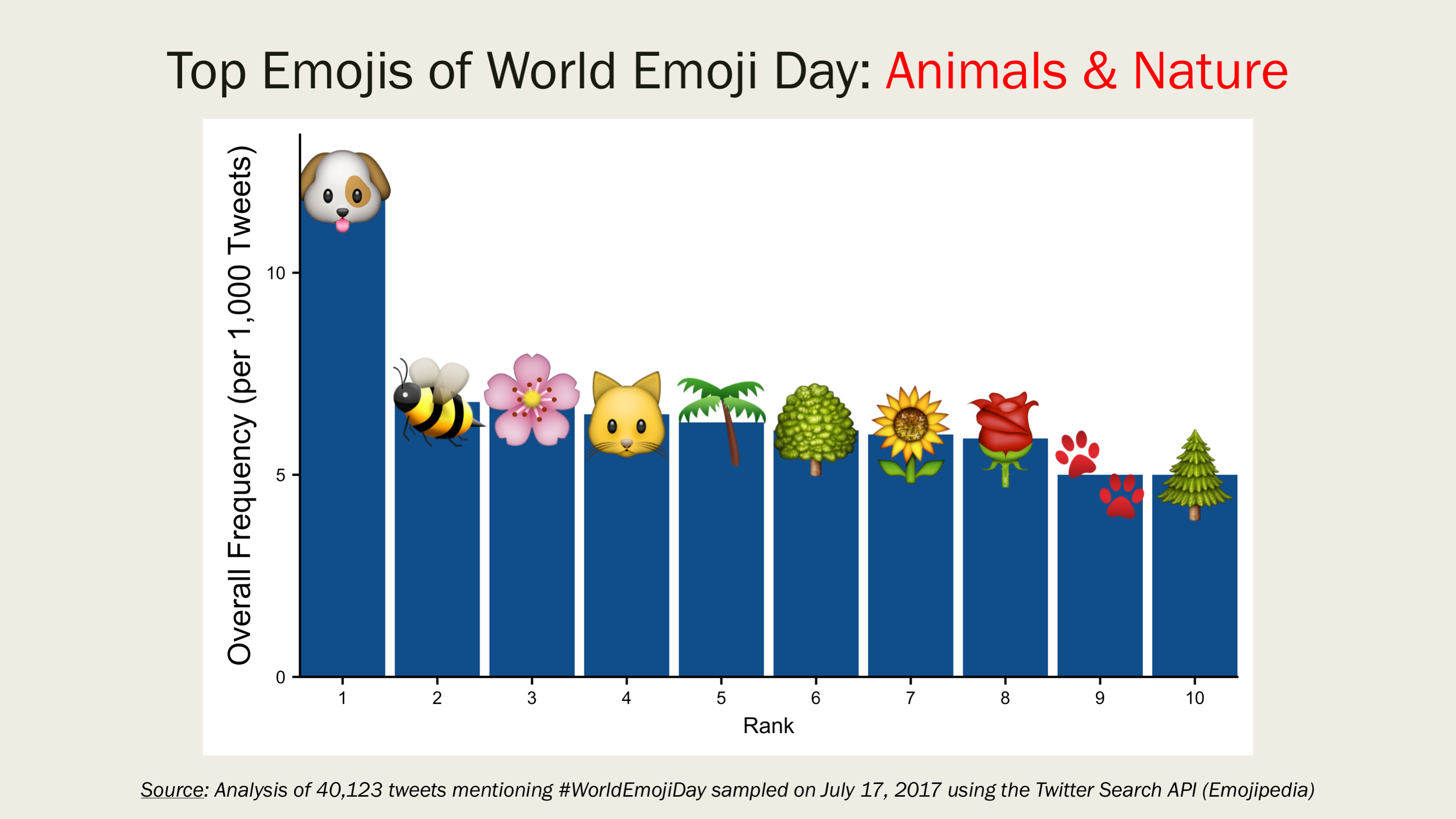 The top emojis in the animals & nature category are ๐ถ dog face, ๐ honeybee, and ๐ธ cherry blossom. For example: