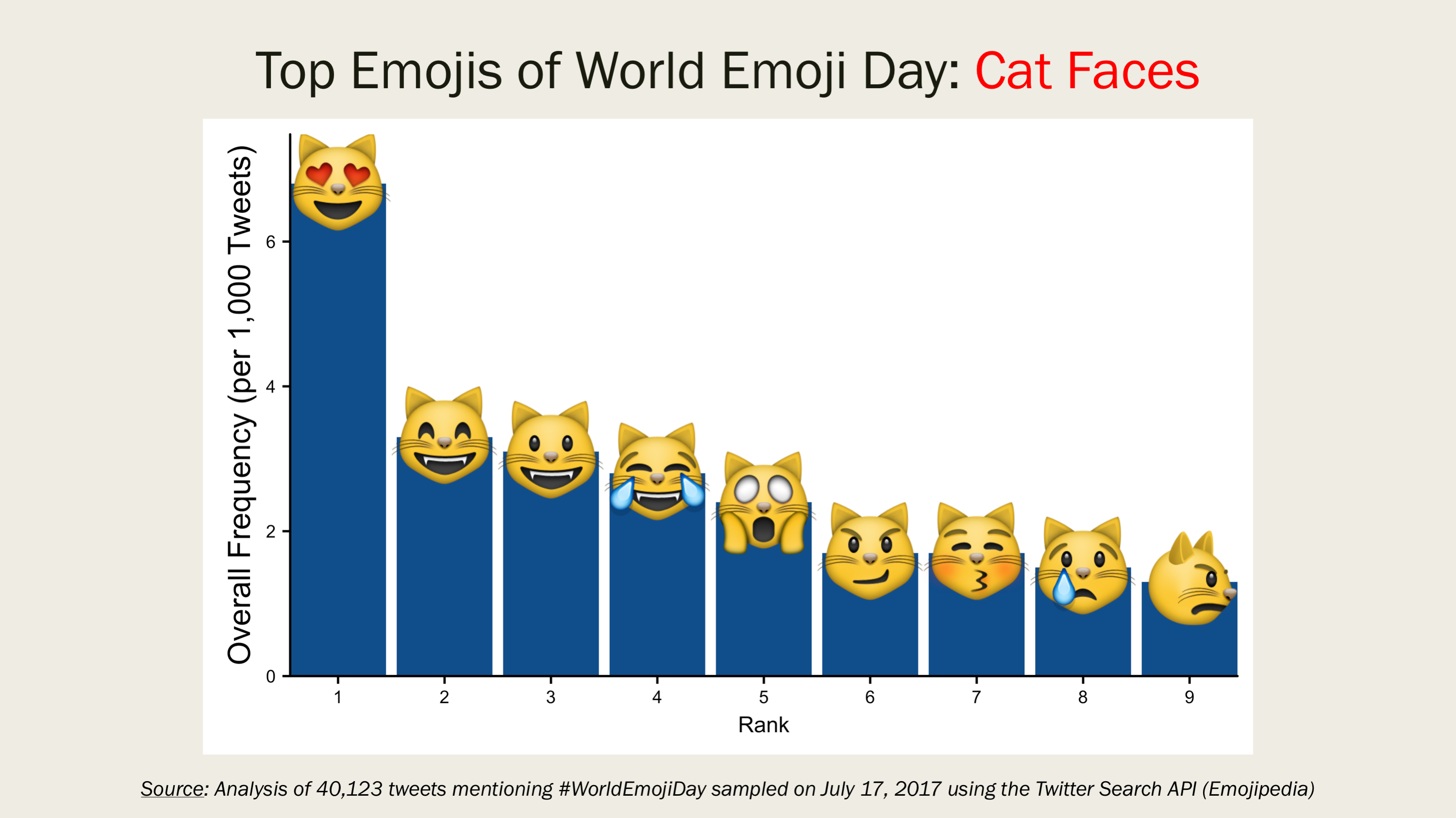 Contrary to human face emojis, where we typically observe an ordering of tears of joy, heart eyes, smiling face, with cat face emojis, we find ๐ป heart eyes emoji reigns supreme, followed by ๐ธ grinning face and ๐บ smiling face, and in fourth position, ๐น tears of joy. Perhaps one day, cat emoji data scientists will reveal some hidden meaning behind these patterns of data.