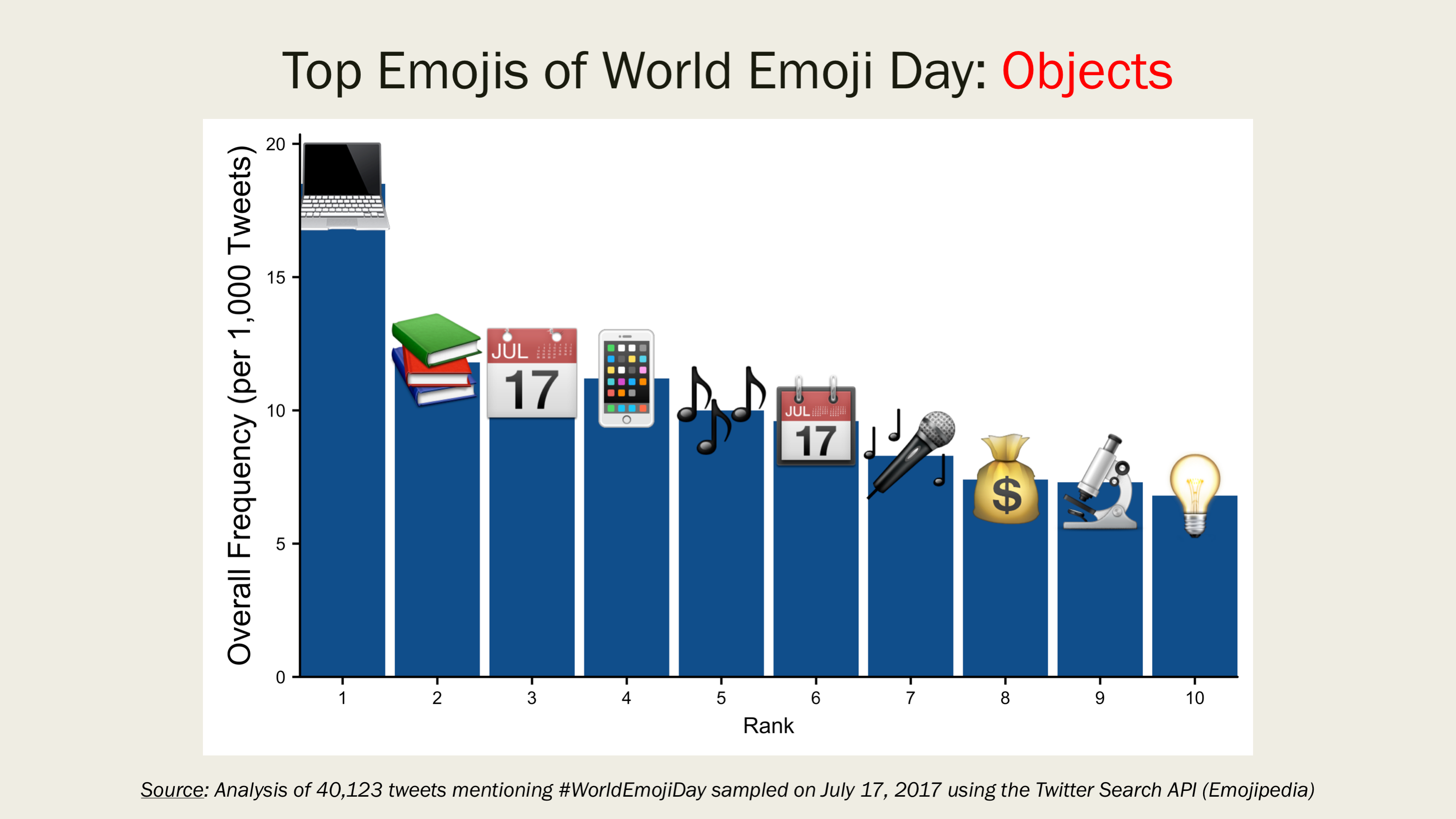 We turned to the Twitter Search API and downloaded English-language tweets mentioning #WorldEmojiDay on July 17. After removing retweets and deduplicating by user name, we ended up with a dataset of 40,123 tweets.[^1]