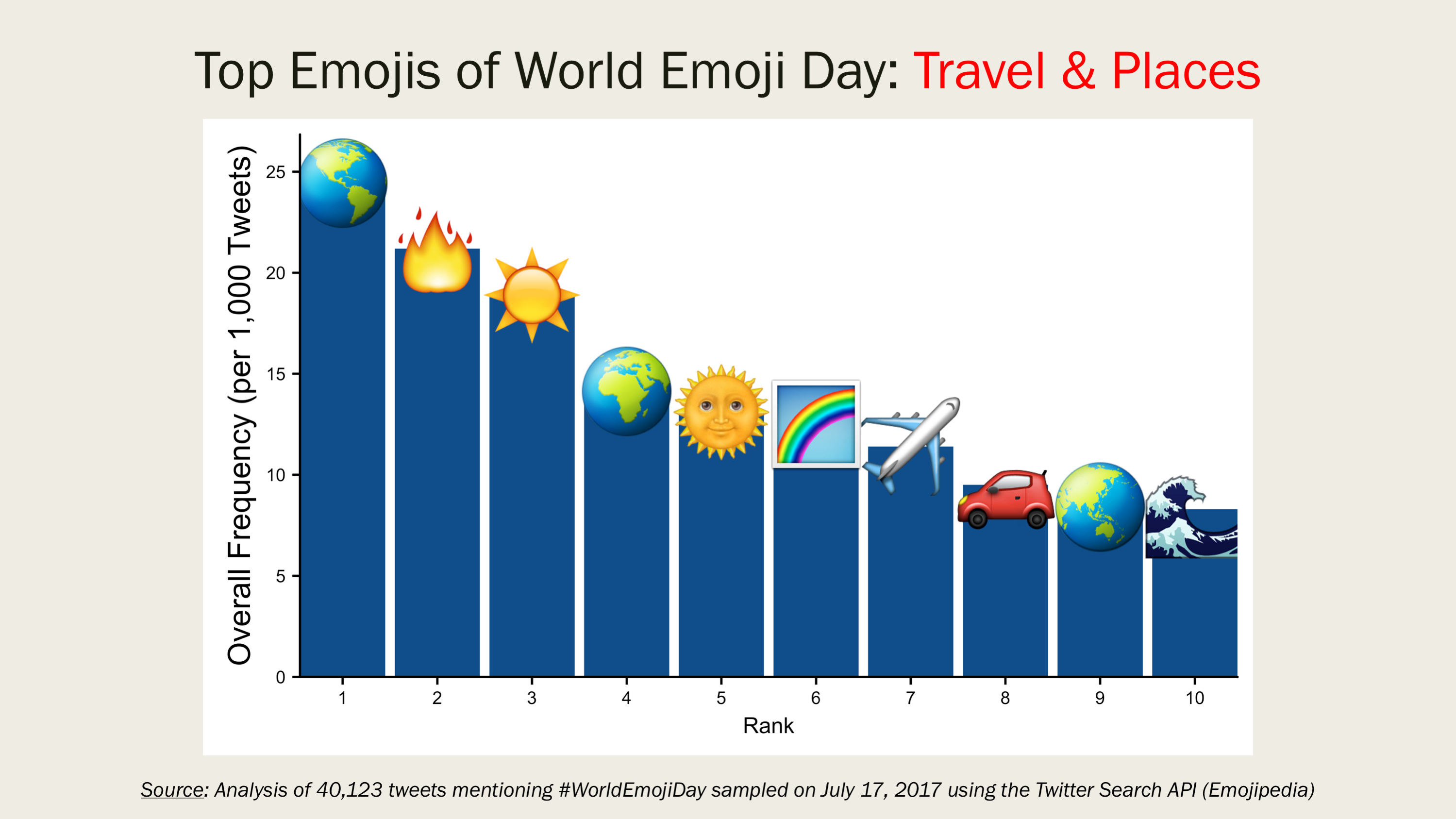 The top travel & places emojis are ๐ globe showing Americas, ๐ฅ fire, and โ๏ธ sun. Fascinatingly, two of the other globes also show up in the top 10, with ๐ globe showing Europe-Africa in fourth place, and ๐ globe showing Asia-Australia in ninth place.