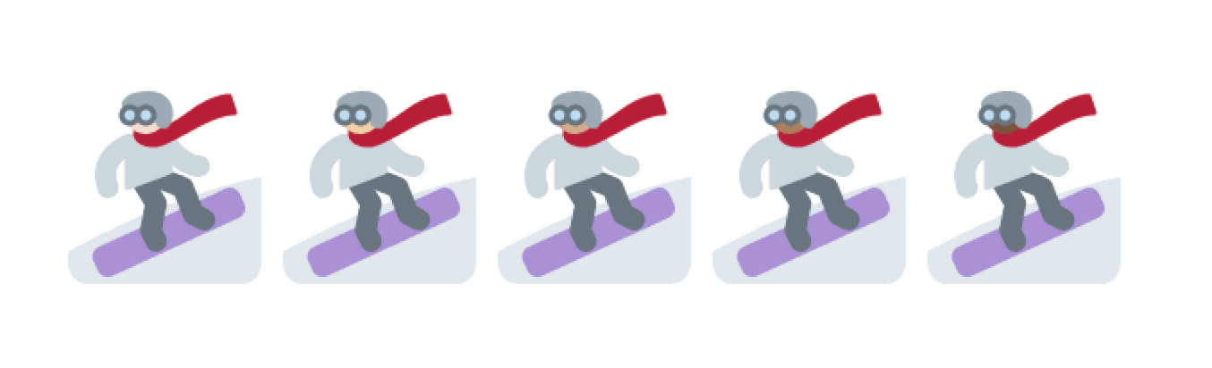 Above: Snowboarder has multiple skin tones available in Twemoji 2.0 not present on iOS or Windows.