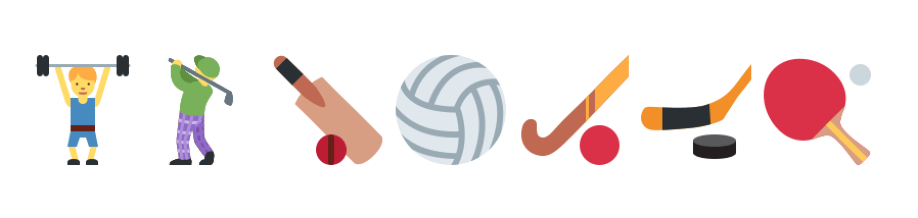 New sports also come from Unicode 8. Notably, the hockey sticks are easier to see at small sizes than the equivalents on other platforms.