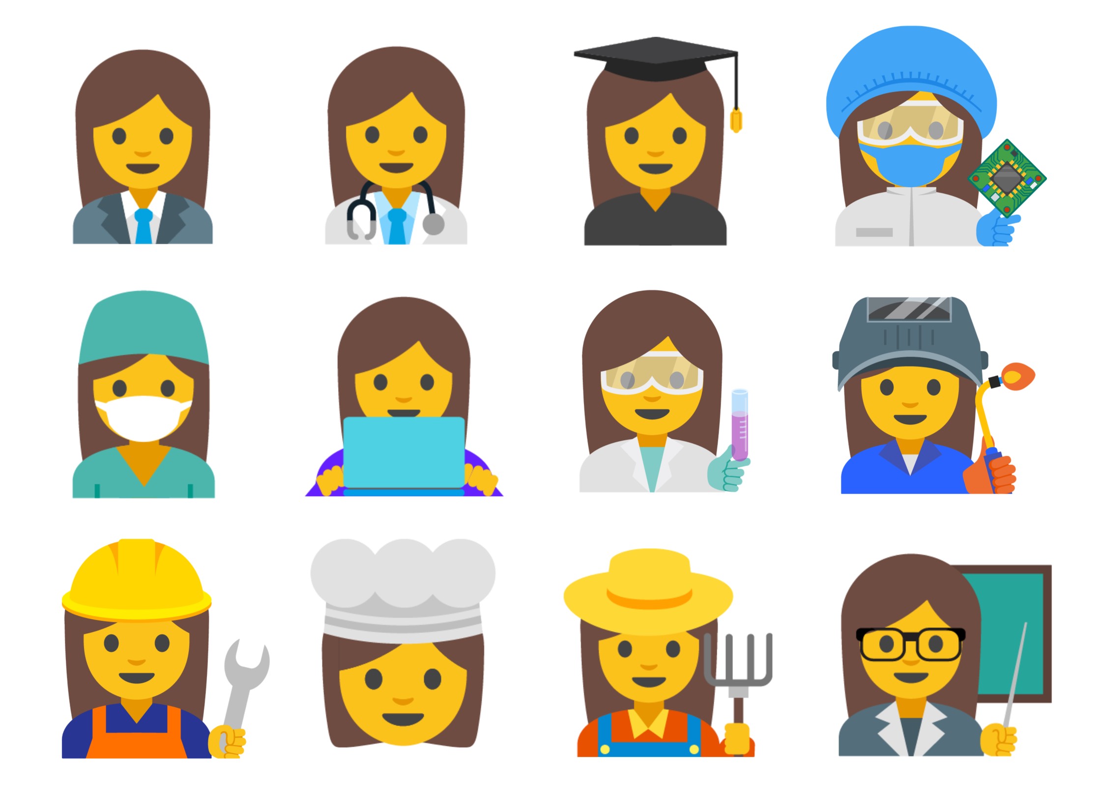 Using this approach, a woman (or man) emoji is combined with an object emoji to create a new emoji for each profession: