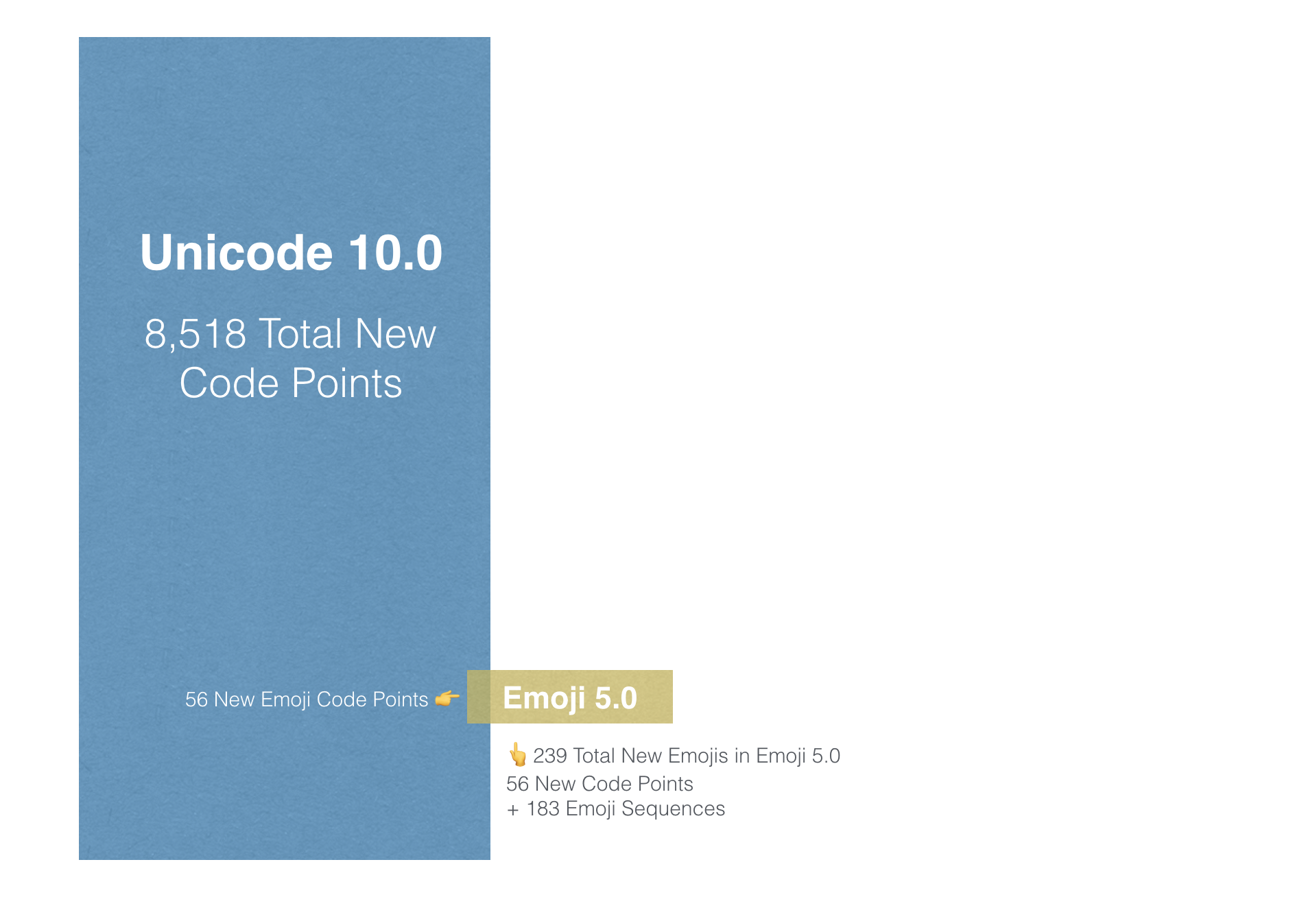 The 56 code points needed to create the 239 new emojis in Emoji 5.0 make up a relatively tiny proportion of new characters in this release.