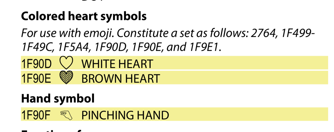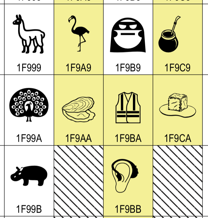 Images shown in these charts aren't necessarily representative of how vendors will design the final images, and this is even more true for color emojis than regular black and white text characters.