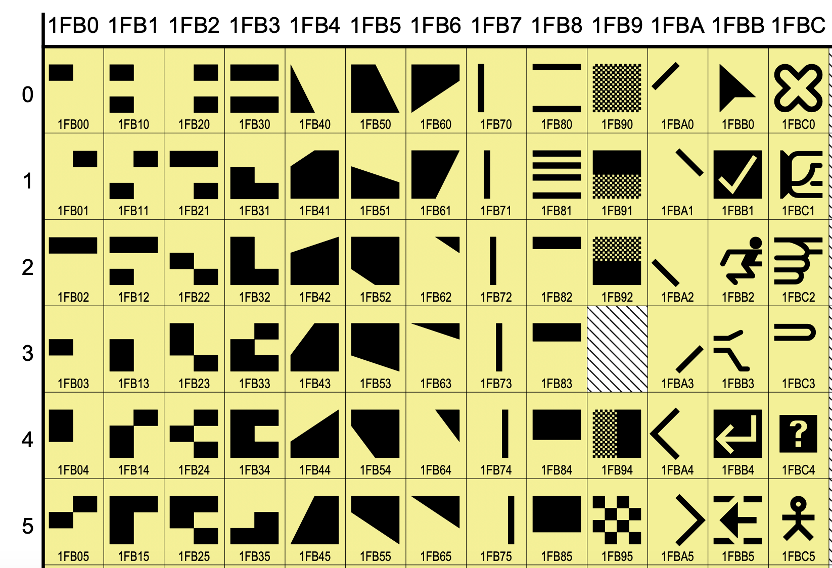 These will permit emulators to correctly display text that would have appeared on computers in the 1970s and 1980s, if re-implemented in 2020. Many of these glyphs join in horizontal sequence to create larger shapes or symbols.