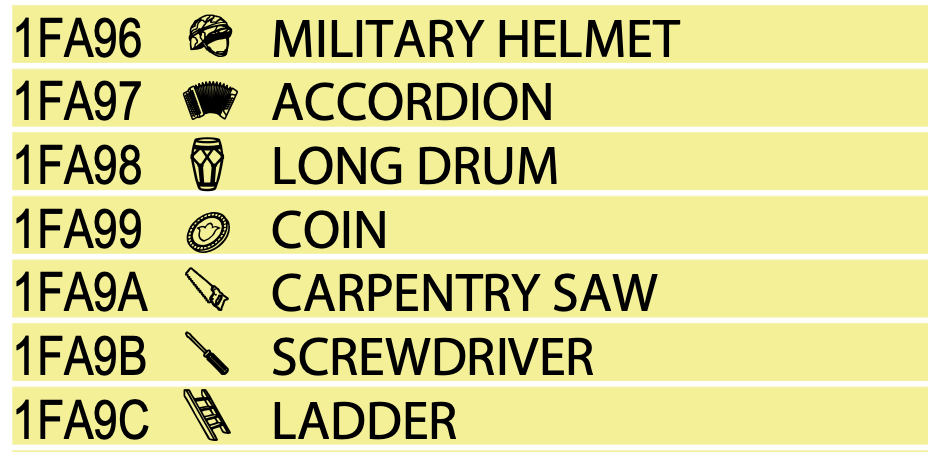 Symbols added in this release (which aren't implemented as emojis) include a Creative Commons symbol, as well as other related glyphs for non-commercial licences, or to indicate where attribution is required.
