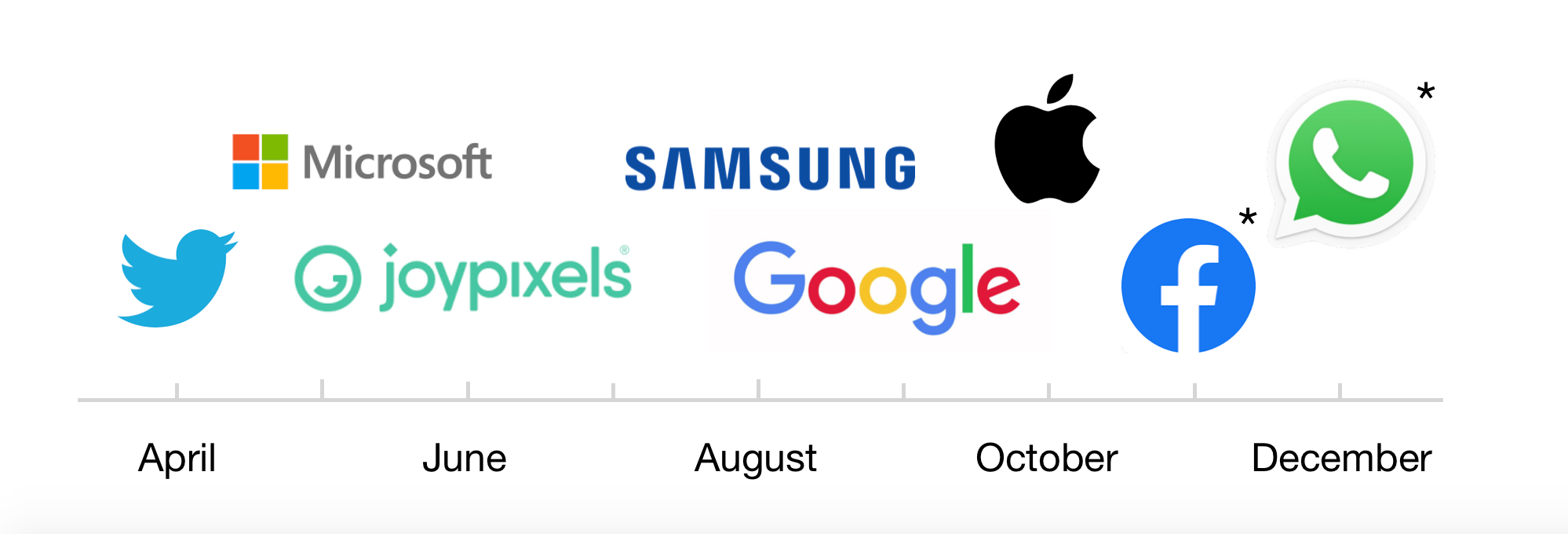 The rollout date for each platform varies. On iOS, updates apply to all apps at the same time, as emojis are provided system wide. On Android, many apps have their own rollout schedule: WhatsApp is on its own timeline, as is Twitter with Twemoji.