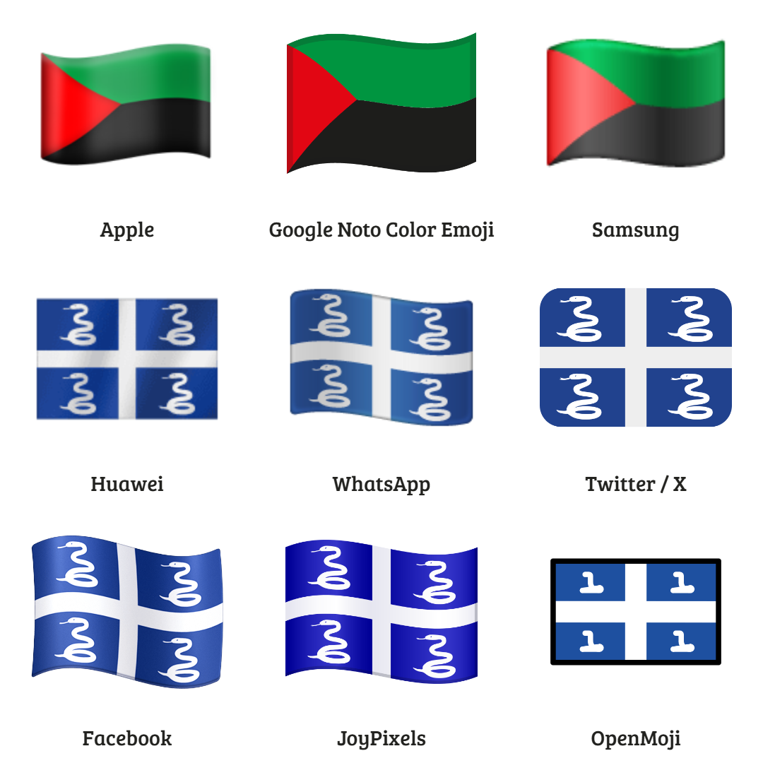 Before 2023, the flag of France was the only officially recognized flag of the island, though most emoji vendors instead displayed the historical snake flag of Martinique, which was withdrawn from use in 2018.