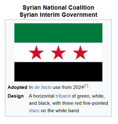In the future, it may well be updated to show the green, white, and black flag of the Syrian opposition to Assad's regime (often called the Syrian National Coalition). This flag design harks back to the flags of the first and second Syrian Republics.