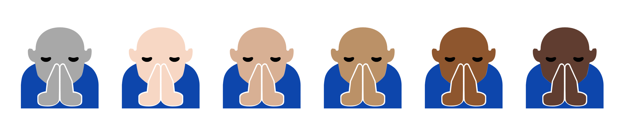 Left-Right: Person With Folded Hands shown with default appearance, pale, cream white, moderate brown, dark brown, and black skin tones.