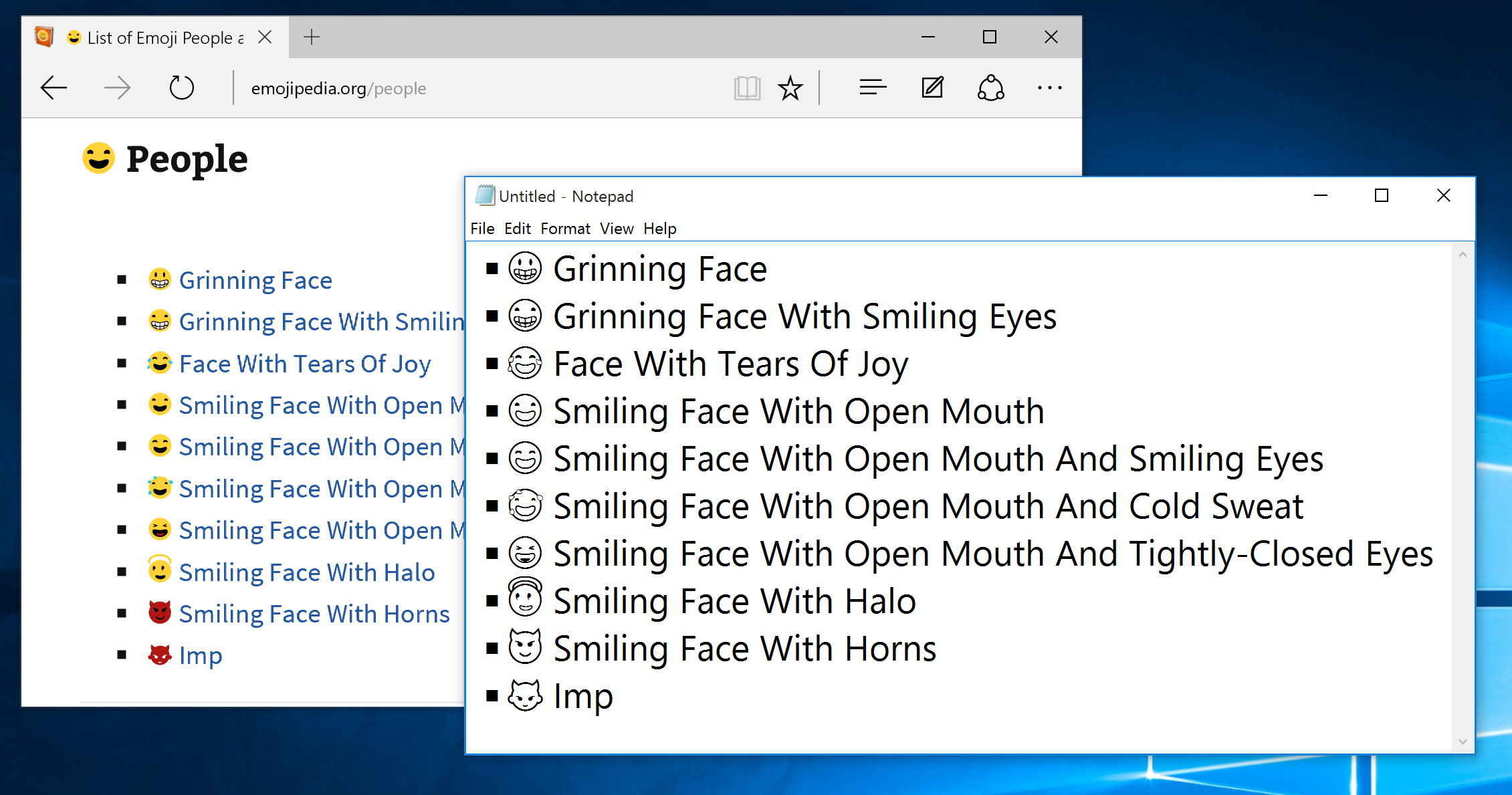 Above: Windows 10 uses black and white emojis in most apps, except Microsoft Edge
