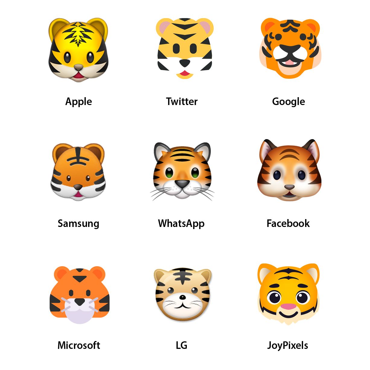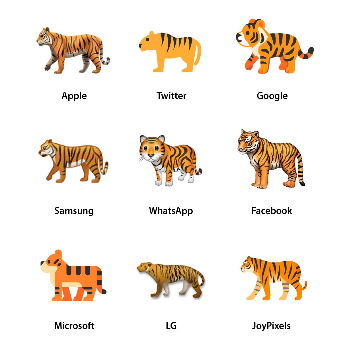 Why two tigers? The aforementioned early Japanese emoji sets each had slightly different set of animals available within their emoji keyboards, so leading up to Unicode 6.0 the Unicode Consortium standardized those which were available (e.g. the ๐ฏ Tiger Face), with some ending up having two versions based on the concurrent desire to include generic animal symbols to cover zodiacal symbols (e.g. the full-bodied ๐ Tiger).